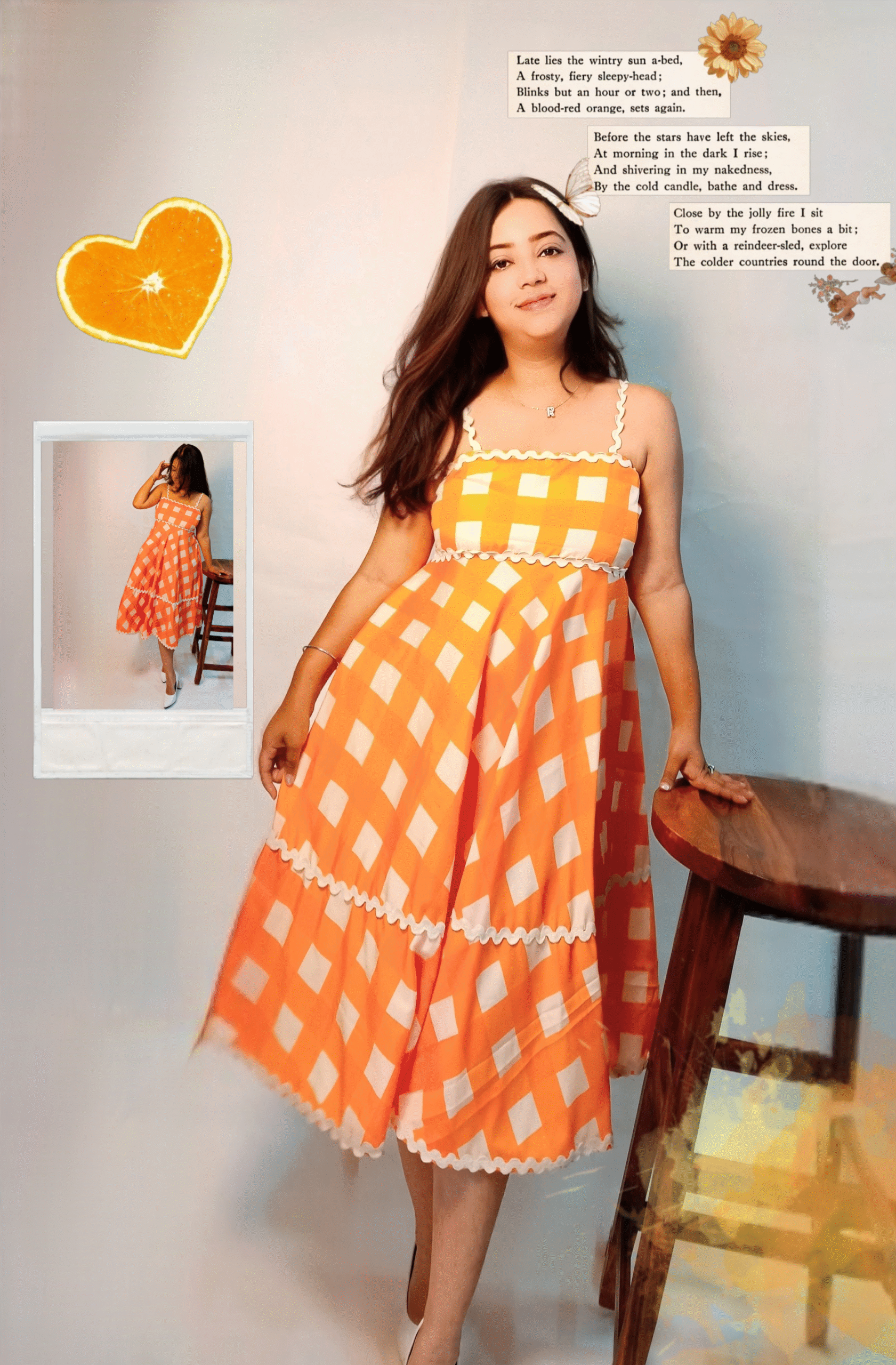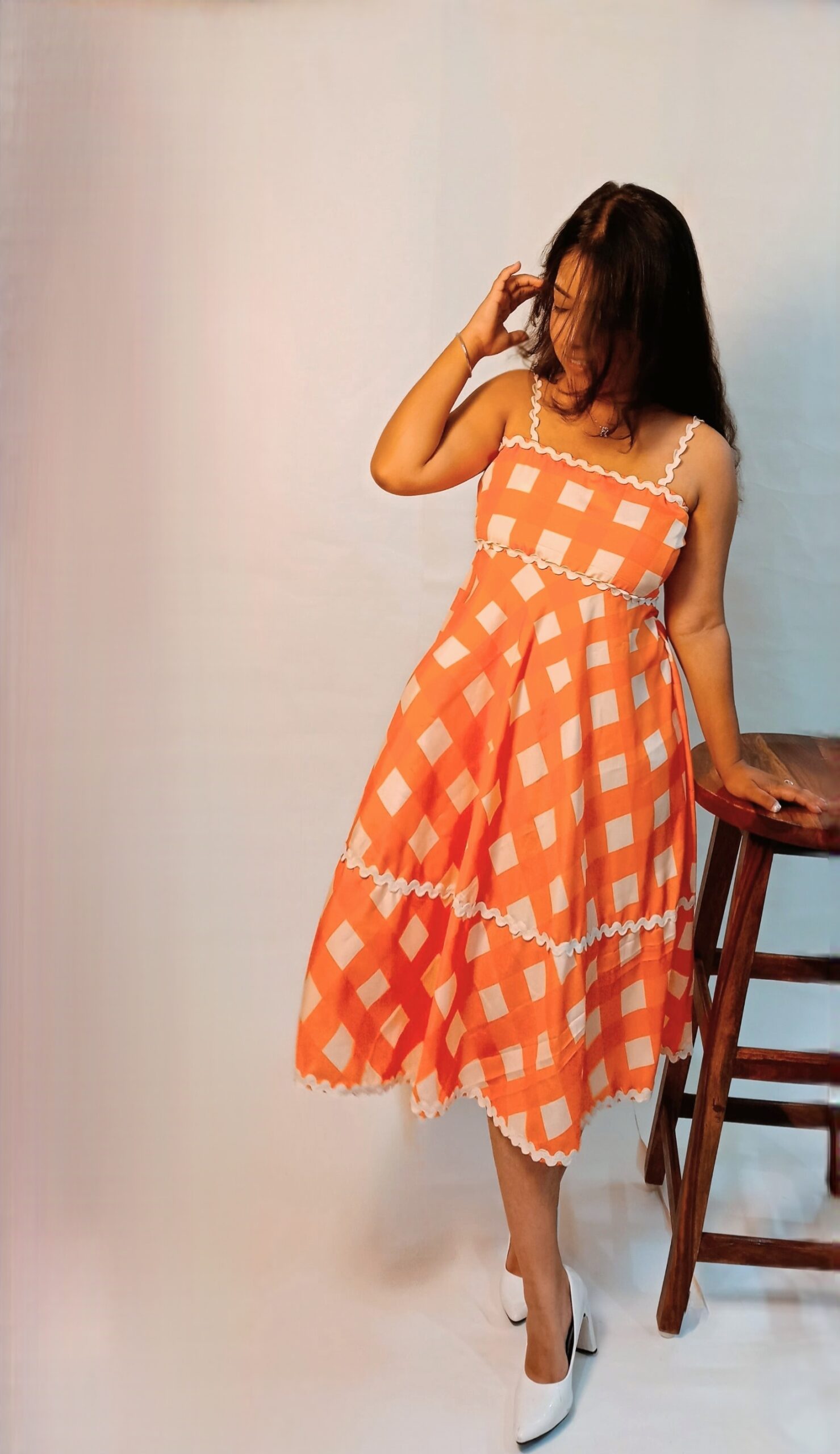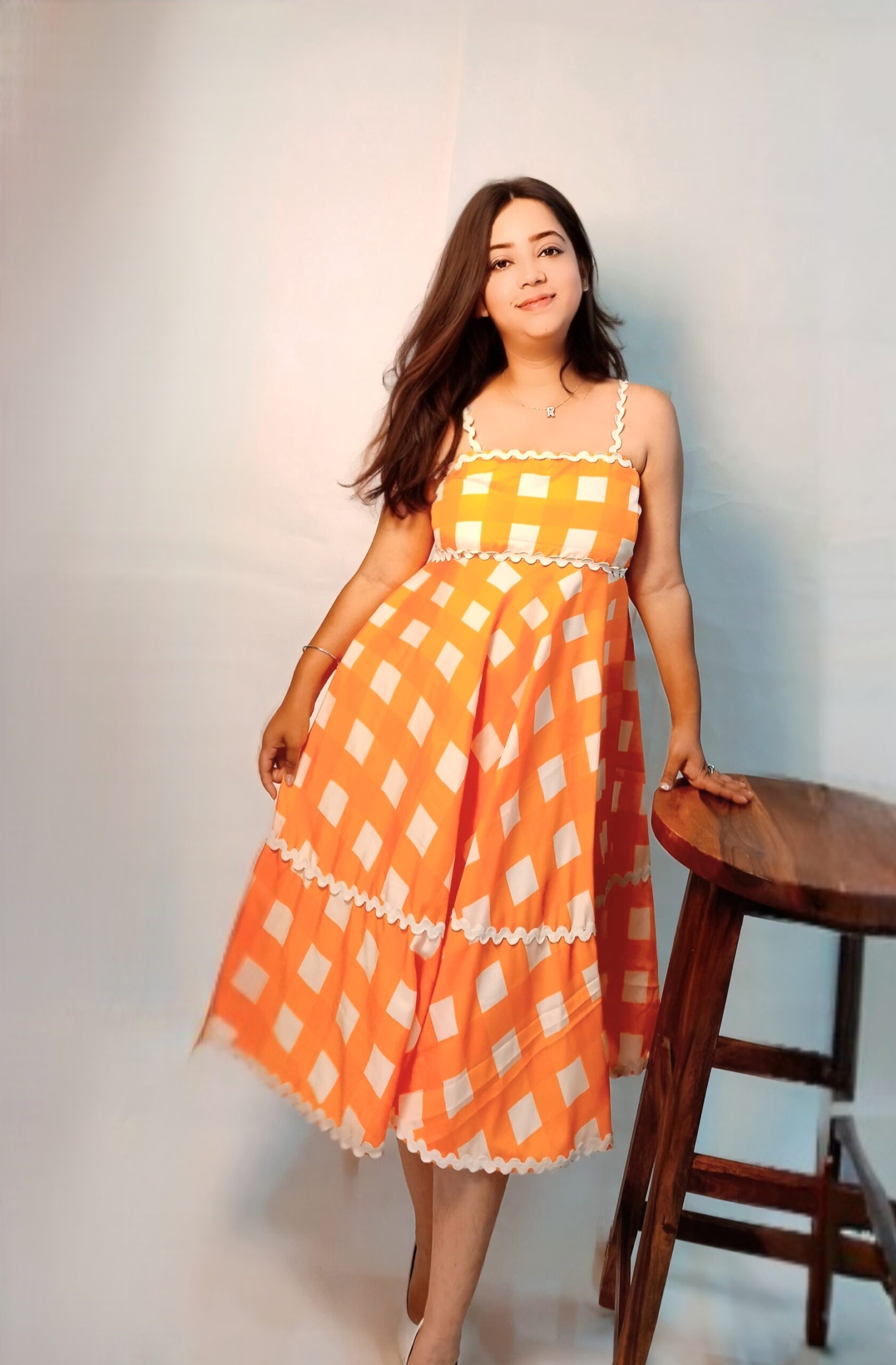 Made from soft, breathable fabric with a bold orange checkered print